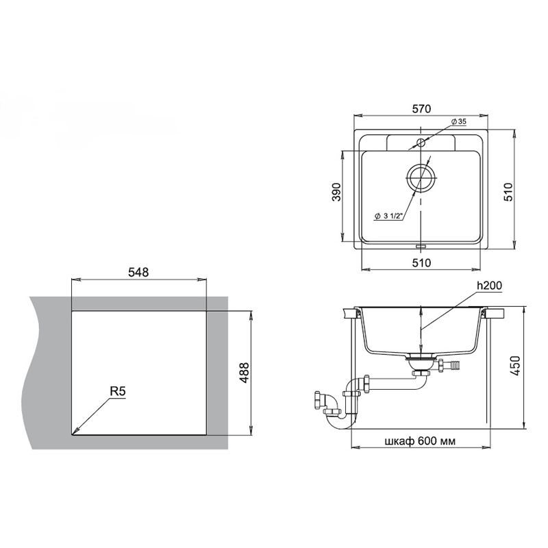 Установочный проем: 548x488 мм