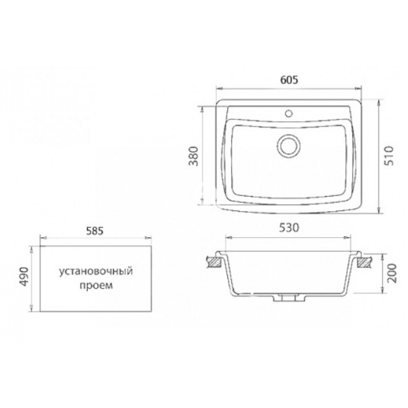 GF-S--605 черный, 605*515мм, GRANFEST Мойка квадр., мрамор, врезн.