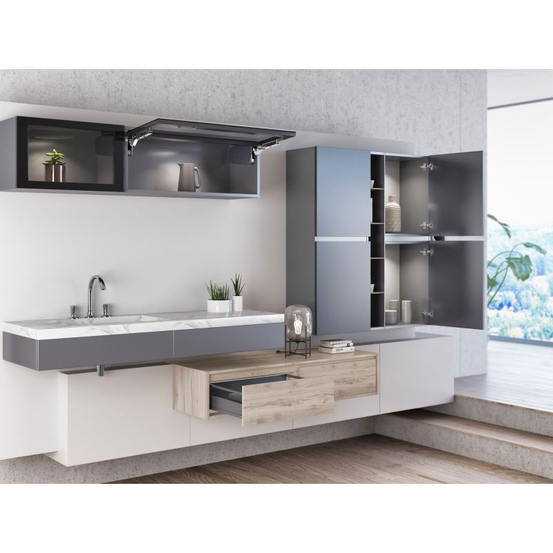 Плавное и бесшумное движение подъемника D-Lite Lift обеспечивает силовой механизм, регулируемый в трех плоскостях. Подъемник позволяет зафиксировать дверцу фасада в любом положении благодаря ступенчатому принципу открывания.