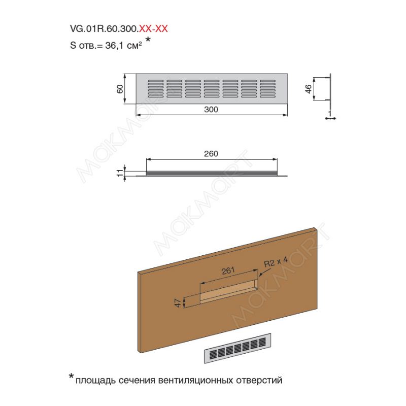 Вентиляционная решетка 01R, 300x60мм, отделка золото шлифованное (анодировка)