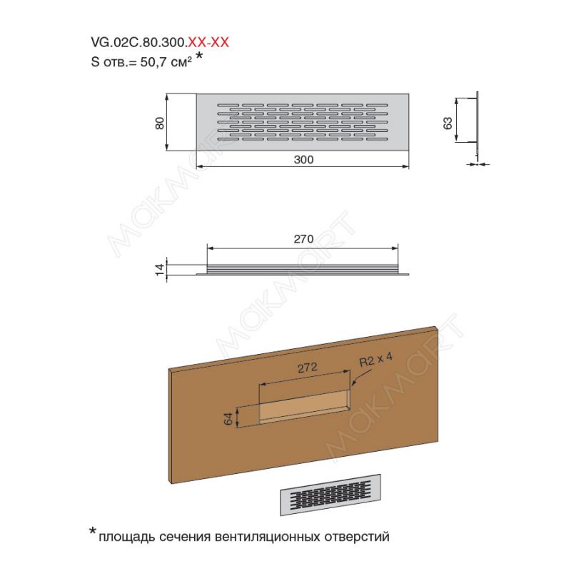 Вентиляционная решетка 02C, 300x80мм, отделка золото шлифованное (анодировка)