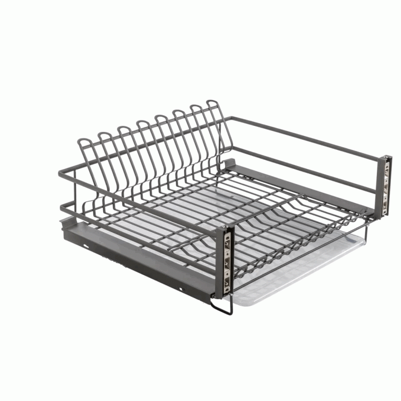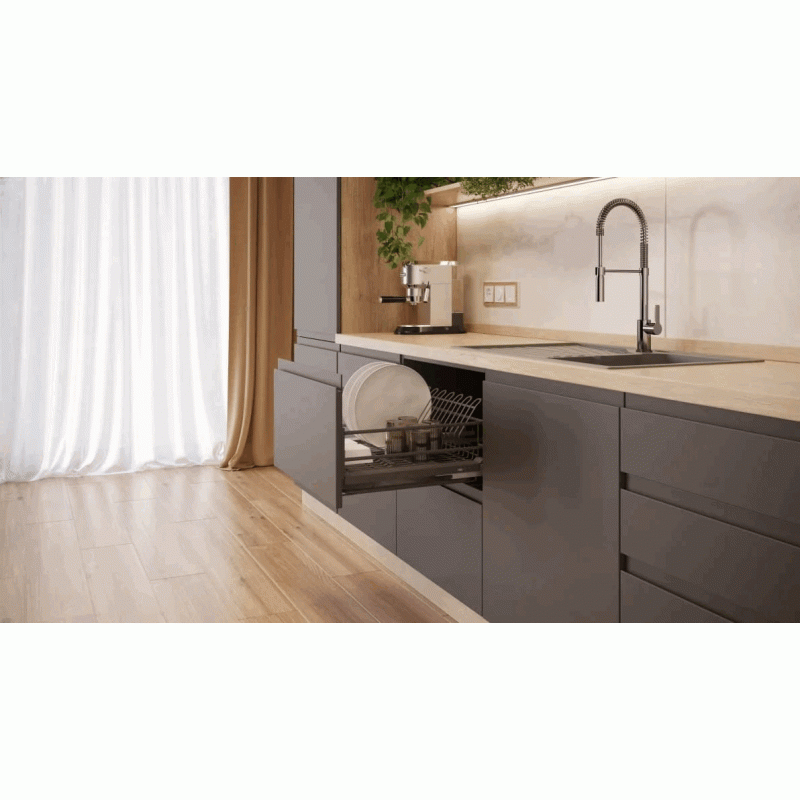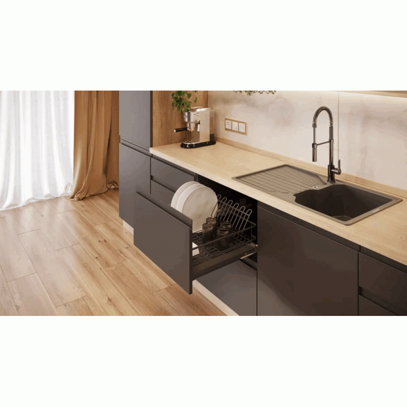 Сушилка выкатная для посуды в нижнюю базу GTV MOVIX PRO, 600 мм с креплением фасада, с поддоном, без направляющих, антрацит - выдвижная сетчатая емкость, устанавливаемая в модуль кухонного гарнитура. Используется для сушки и хранения посуды, извлекается из шкафа и убирается обратно за счет шариковых направляющих полного выдвижения.