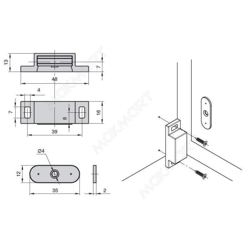 Магнит накладной К4 с ответной планкой (под шуруп), цвет белый