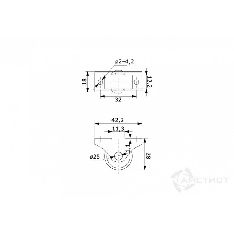 Ширина 18мм, высота 28мм. Материал ролика - полипропилен с добавлением нейлона. Расчетная нагрузка на один ролик - 25 кг.