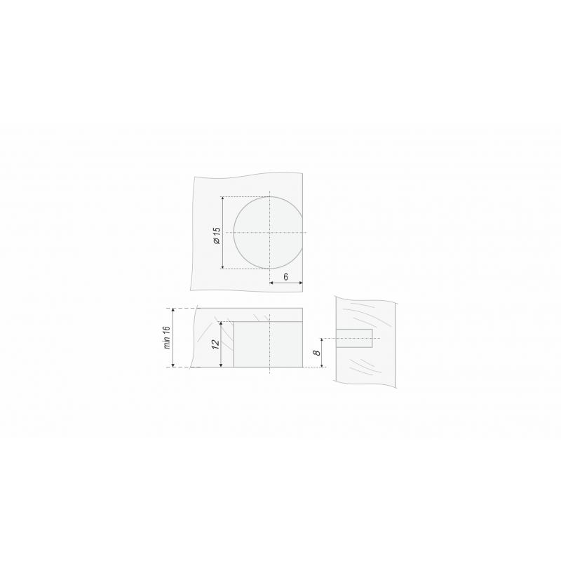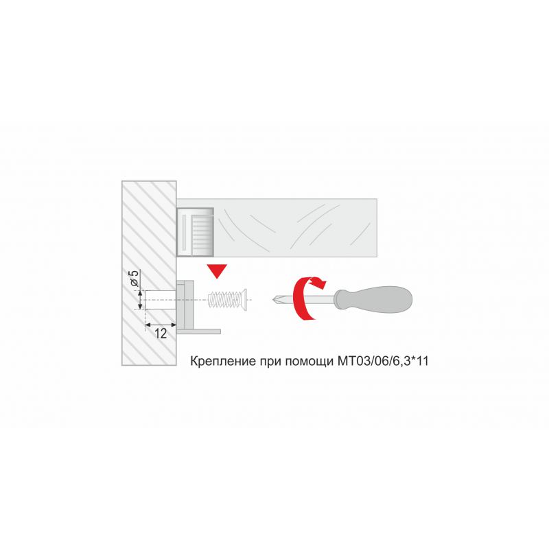 Для монтажа полки необходимо в плитном материале подготовить отверстие 15х12 мм, установить пластиковый корпус полкодержателя, прикрепить металлический фланец к боковой стенке мебели на саморез или евровинт MT03/06/6,3*11Cr/0 и надеть полку на фланцы.