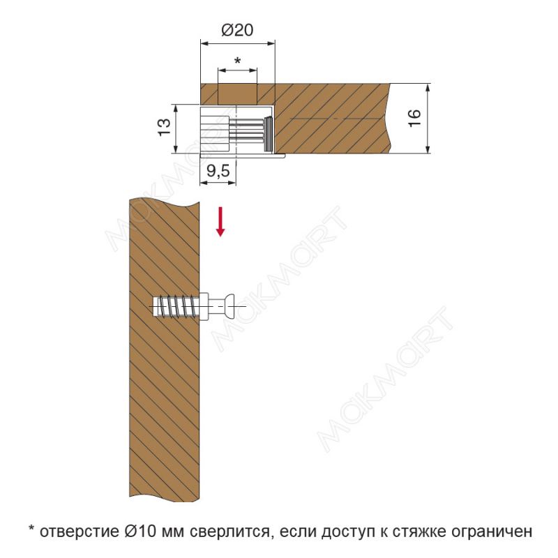Монтаж стяжек данной серии производится вертикально на шток. Важной особенностью изделия является высокое качество пластикового корпуса: при запрессовке стяжек вы никогда не столкнетесь со сколами облицовочного пластика на ДСП / МДФ.