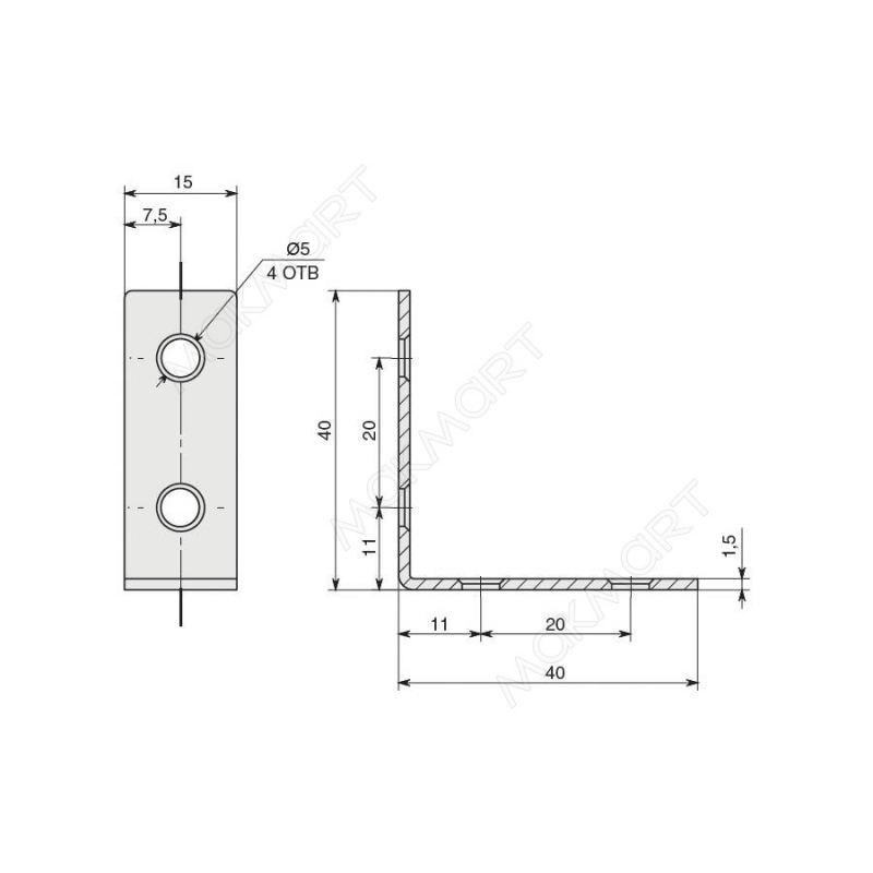 Уголок 40х40х15 (1,5мм) с 4-мя отверстиями, отделка цинк