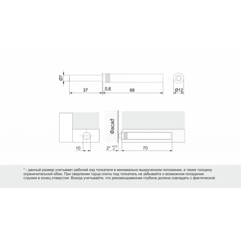 Толкатель AMF14/GR – классический компаньон мебели без ручек, он предназначен для распашных фасадов на петлях с пружиной. Способен выталкивать даже тяжелые и крупные фасады на 37 мм. Обладает регулировкой расстояния зазора между наконечником толкателя и фасадом в закрытом положении +5 мм.
