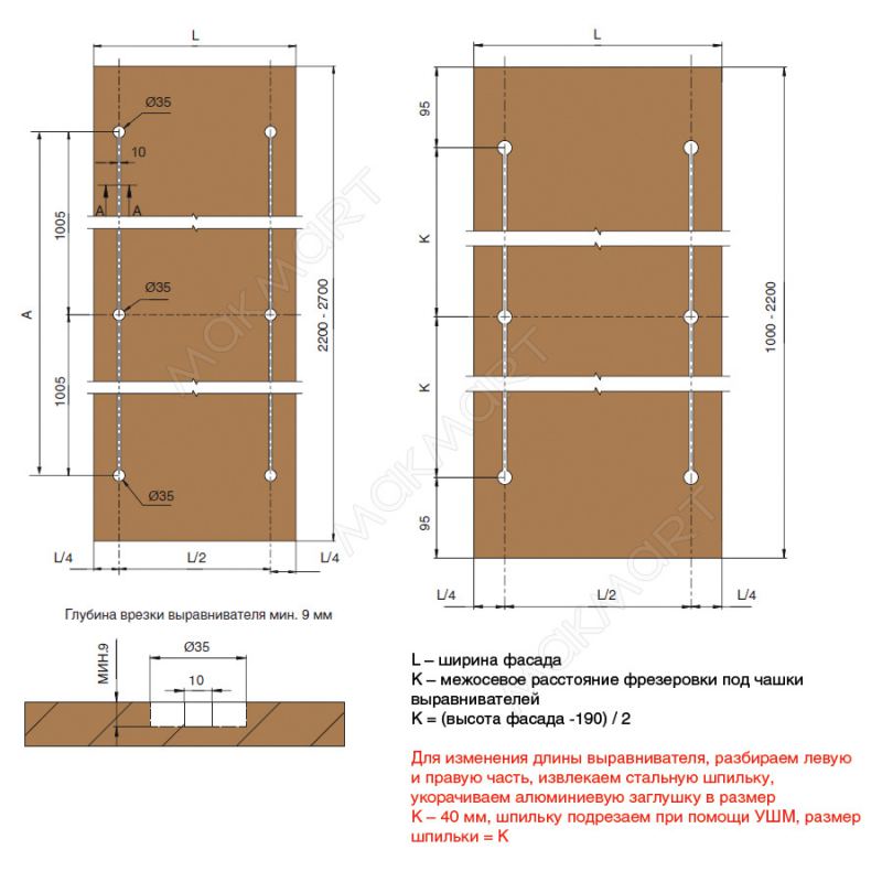 распашных фасадах. Также у выравнивателя небольшая глубина врезки, всего 9 мм, что дает возможность его устанавливать даже в 16 мм