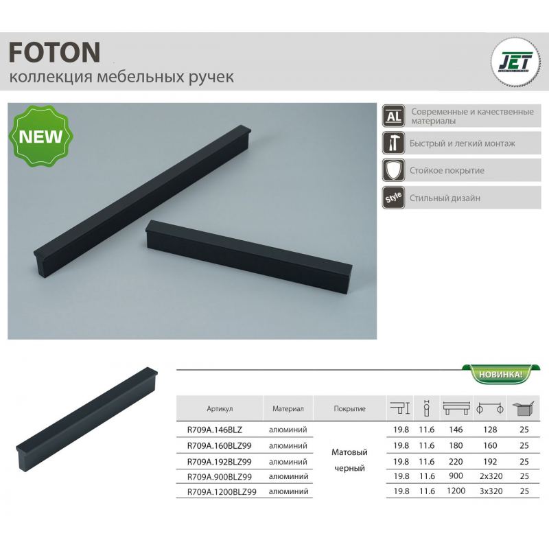 Ручка мебельная JET 709 накладная м.ц.3*320мм L 1200мм,алюминий, Черный матовый R709A.1200BLZ99
