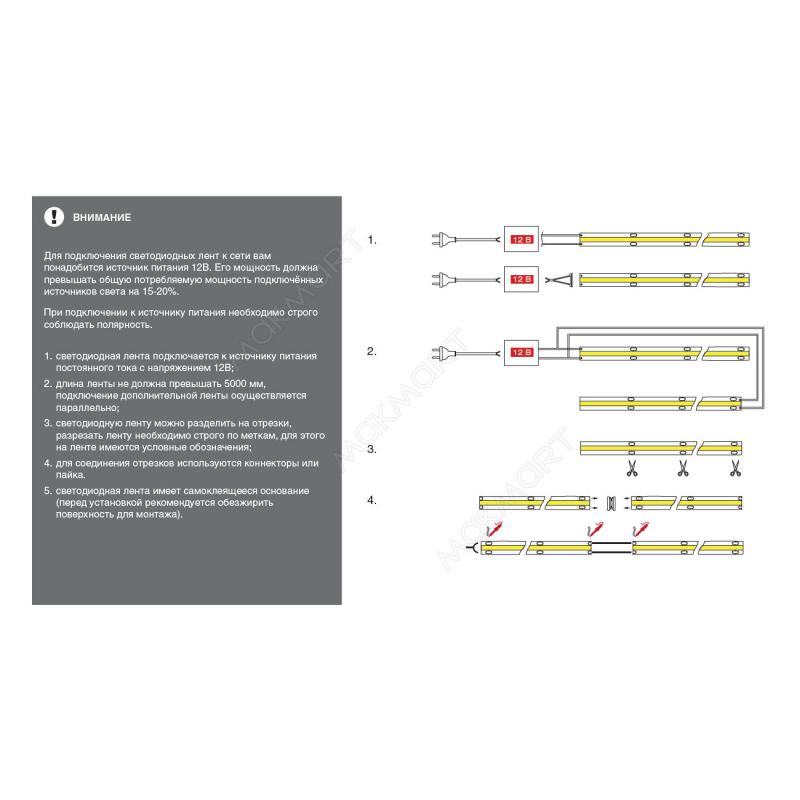 Для подключения светодиодных лент к сети вам понадобится источник питания 12В. Его мощность должна превышать общую потребляемую мощность подключённых источников света на 15-20%. Комплекты источников питания, источники питания, провода, блоки распределительные, выключатели и датчики заказываются отдельно.