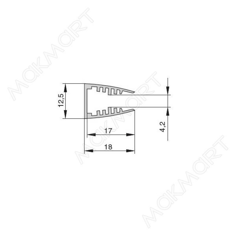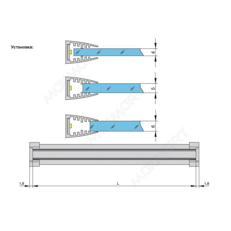 Профиль устанавливается на заднюю сторону стеклянных полок толщиной 4 - 6 мм.