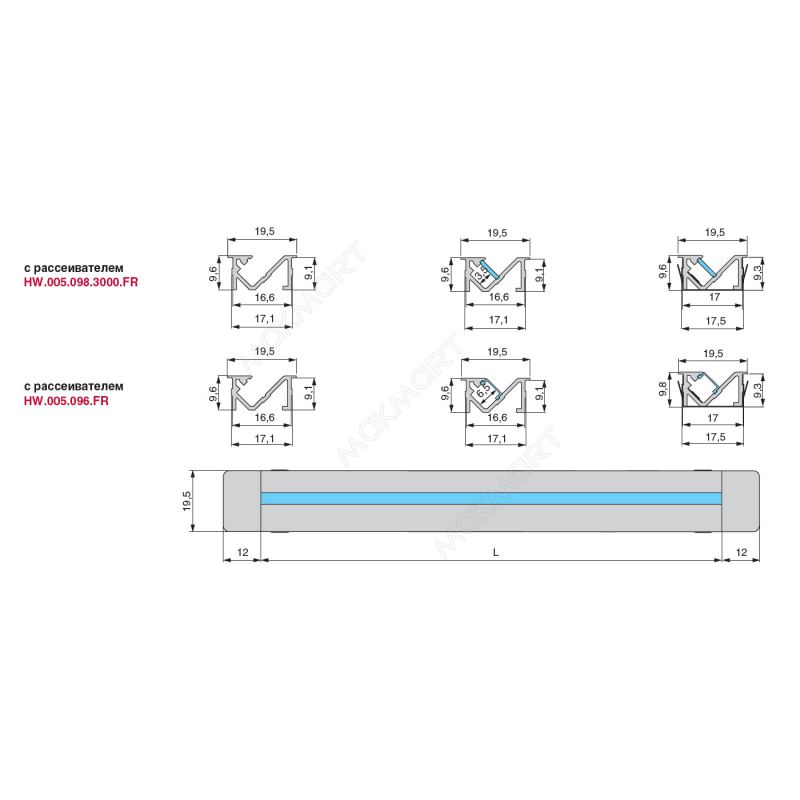 | РАЗМЕР | Ширина (B, мм)19.5Длина (L, мм)3100Высота (H, мм)9.6Ширина площадки под ленту (мм)5.5Для LED ленты шириной (мм)4, 5 |