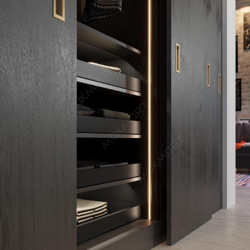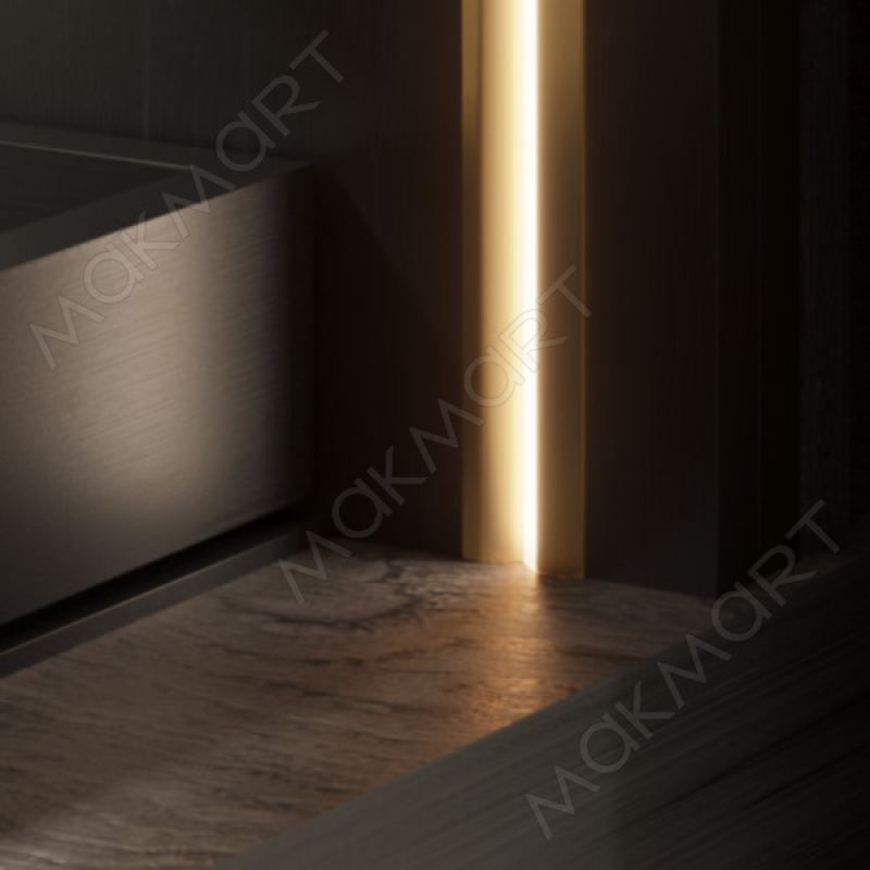 Данный вид профиля применяется для подсветки мебели, торгового и рекламного оборудования. Благодаря установке ленты под наклоном световой поток направляется во внутреннее пространство мебели и не слепит глаза. Тонкая полоса рассеянного, без эффекта видимых точек, света подчёркивает утончённость и лёгкость мебели. Лёгкий и прочный профиль изготовлен из алюминия и представлен в отделке золото шлифованное (анодировка). Длина профиля – 3100 мм.
