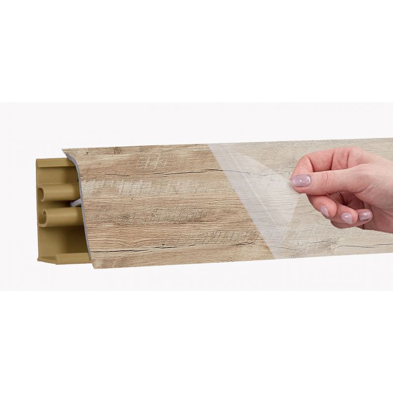 Уплотнитель у этого плинтуса интегрирован с декоративной частью плинтуса и декор также нанесен и на уплотнитель.