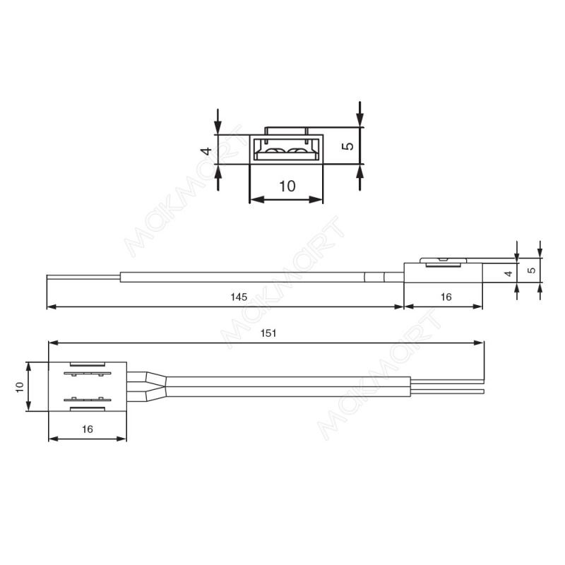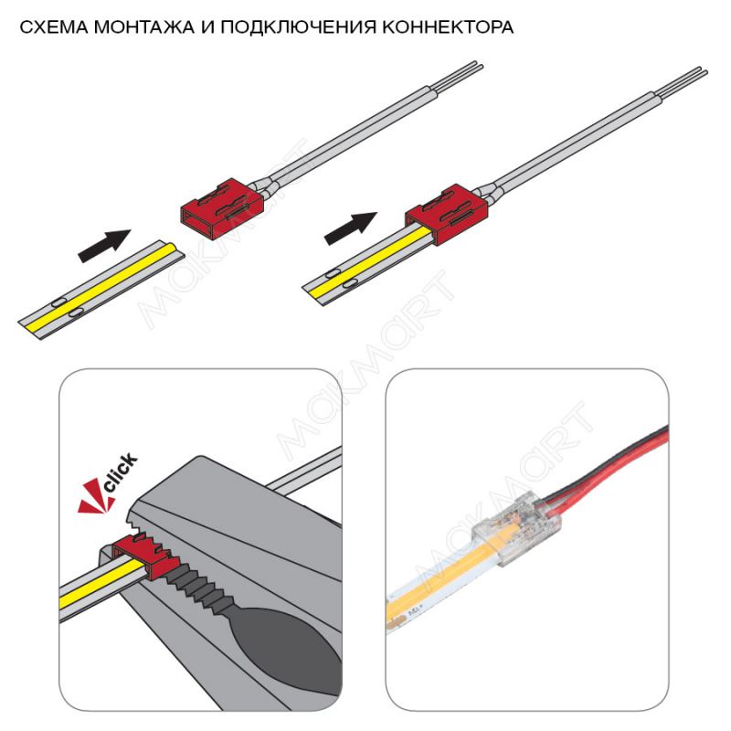 LED – коннектор с проводом 145 мм, для соединения отрезка светодиодной одноцветной ленты COB шириной 8 мм с источником питания. Максимальный допустимый ток – 5 А, номинальное напряжение – 36 В, степень пылевлагозащиты – IP20.