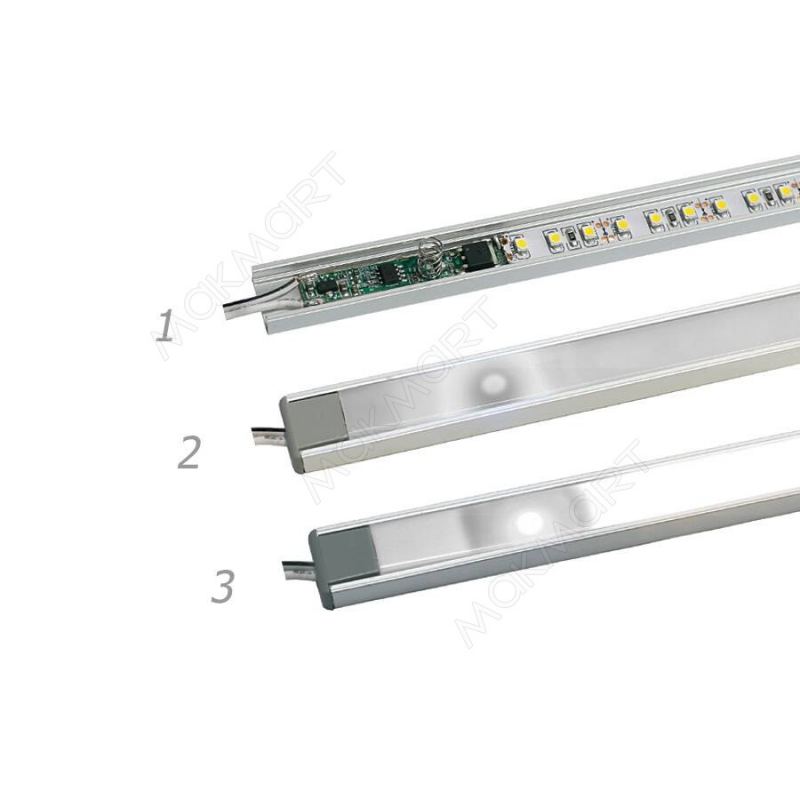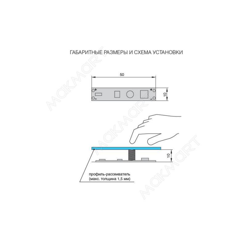 Выключатель HW.012.AD003 с диммером применяется совместно с алюминиевыми профилями для LED-подсветки и светодиодными лентами. Выключатель реагирует на прикосновение к рассеивателю, короткое нажатие - вкл/выкл, длинное нажатие — диммирование. Место прикосновение обозначено светящимся диодом белого цвета. Предназначен для профилей с внутренней высотой равной не более 10 мм (от поверхности профиля до рассеивателя).