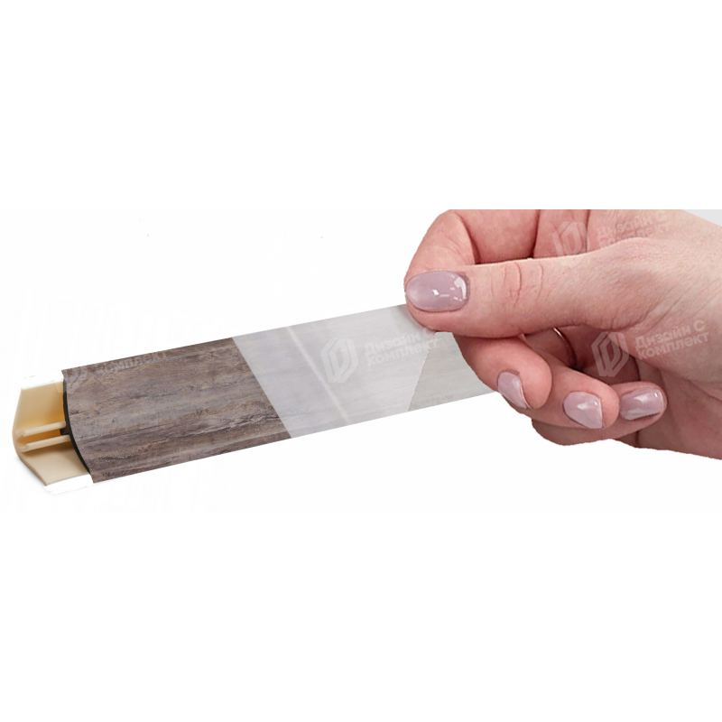 Плинтус состоит из декоративной части и монтажной части из ПВХ с уплотняющими резинками в цвет плинтуса, защищающими от воды и загрязнений.