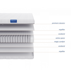 Active space – это пружинный блок Magic Comfort, армированный по системе Ecobond без использования устаревших войлочных материалов и высокоэластичная пена Ergoflex по периметру матраса, которая защищает его от провисания и усиливает жесткость края.