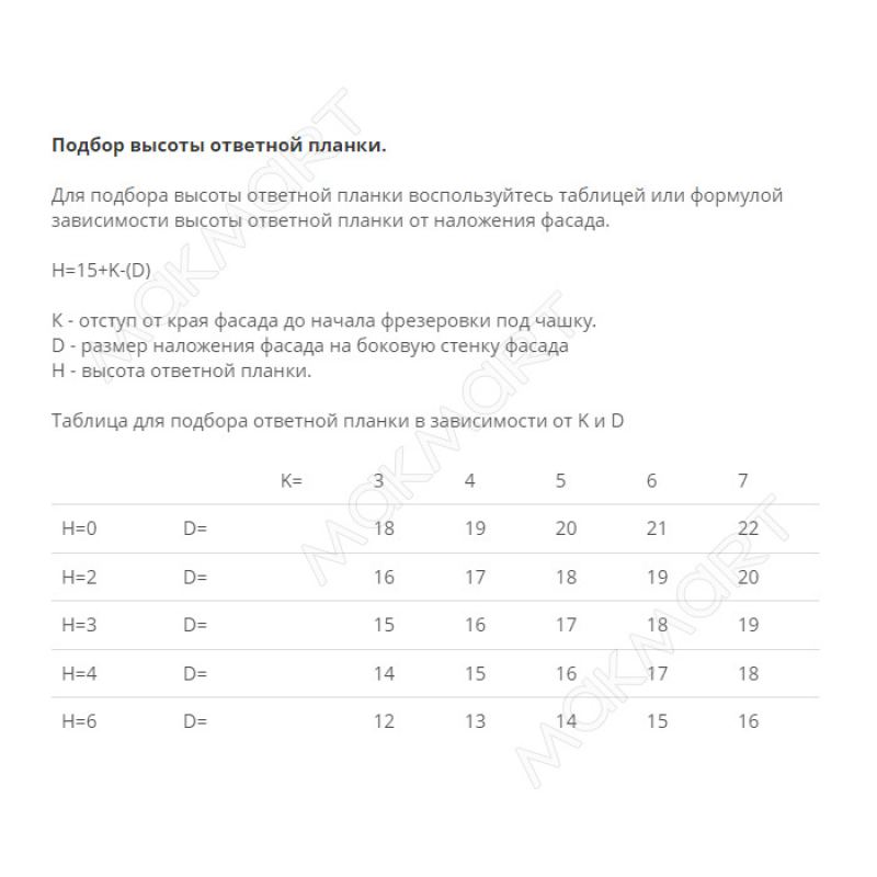 Для подбора высоты ответной планки воспользуйтесь таблицей или формулой зависимости высоты ответной планки от наложения фасада.